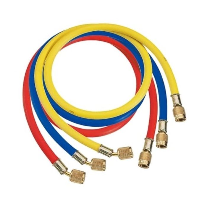 Tuyaux de charge de haute qualité pour tous les réfrigérants courants avec des raccords SAE de 1/4" . Le composé de caoutchouc spécial est extrêmement durable grâce à sa résistance à la pression et à sa faible fragilité.Ecrous de raccord dentelés pour une meilleure prise lors du serrage à la mainFourni avec 1 tuyau jaune, 1 tuyau rouge et 1 tuyau bleu