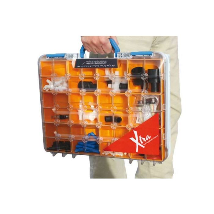 Boite à outils avec connexions et divers accessoires de tuyauterie 12 compartiments contenant une sélection d'accessoires de la marque Xtra