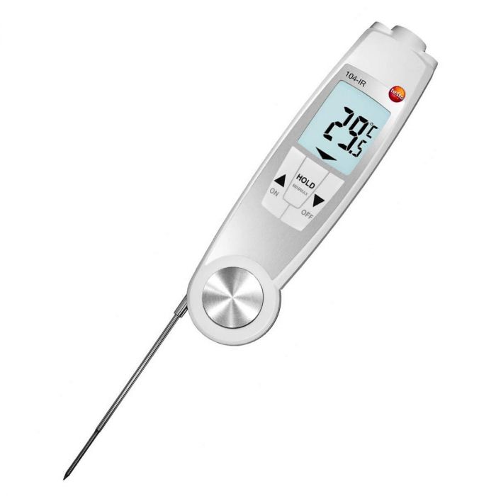 Contenu: thermomètre de pénétration testo 104 avec sonde de température pliable, mode d'emploi, protocole d'étalonnage, bandelettes de couleur autocollantes et piles.