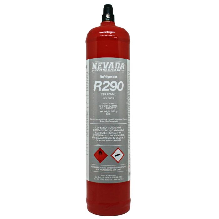 De plus en plus répandu comme alternative aux réfrigérants R22, R134a et R12, le gaz R290 est un hydrocarbure HC pur, considéré écologique en raison de son faible impact environnemental. Bouteille de 370/1000 grammes de réfrigérant R290 (propane) certifié T-PED /EN 13322-1. Il s'agit d'un gaz inflammable (classe A3) utilisé dans la réfrigération commerciale et domestique et dans la climatisation mobile. Les bouteilles sont fabriquées à partir de matériaux durables et répondent aux normes de sécurité les plus strictes.